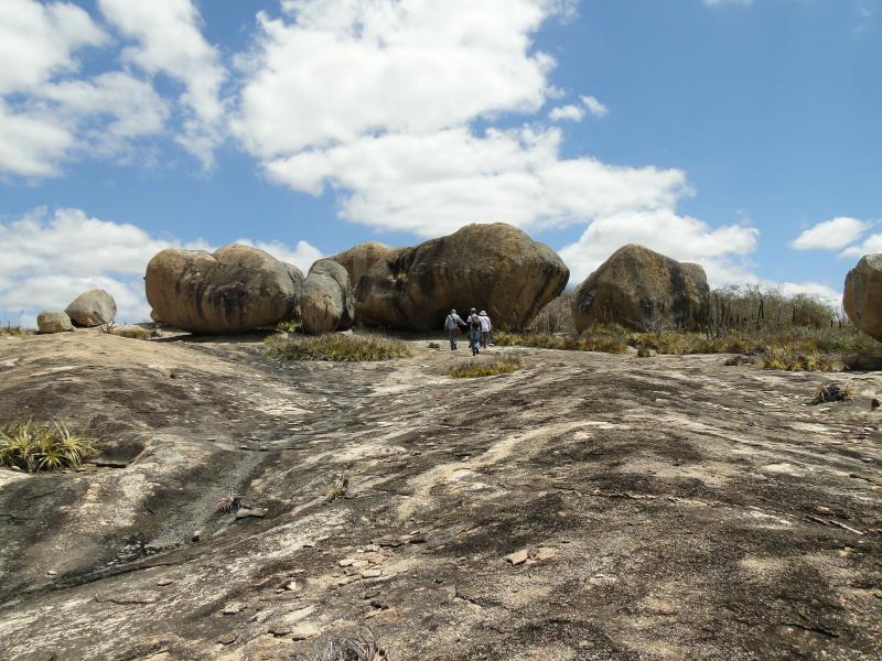 | The Geodiversity Site Lajedo Manoel de Souza, named after a former resident who lived near the place, is a slab of rock (lajedo) with an approximate length of 18,000 m², with a longitudinal shape, a length of about 300 m, a maximum width of 90 m and an average height of 40 m in relation to the flattened surface of its surroundings. It is in the context of Pluton Bravo, of Ediacaran granitoids. On the surface of the slab are large blocks (boulders), as well as basal tafoni and microforms of flutes in the tops of the blocks. The shapes of the blocks often cause the visitor to make imaginative comparisons, such as the Sapo Stone, which resembles the appearance of that amphibian. This slab presents the most expressive set regarding the archaeological collection of the geopark. Many of the rounded boulders of this slab show paintings of the Agreste Tradition where comparatively to other sites of the Northeast can be estimated ages varying between 3,000 and 7,000 years. The predominant motifs are "astronomical" such as representations of the Sun, stars, spirals, etc. and a zoomorphic figure contrasts with this astronomical motif that is that of an ema, about 1 meter long. The predominant color of these paintings is ocher/red. This site is part of the Cariri Paraibano Geopark proposal (Lages et al., 2018). |