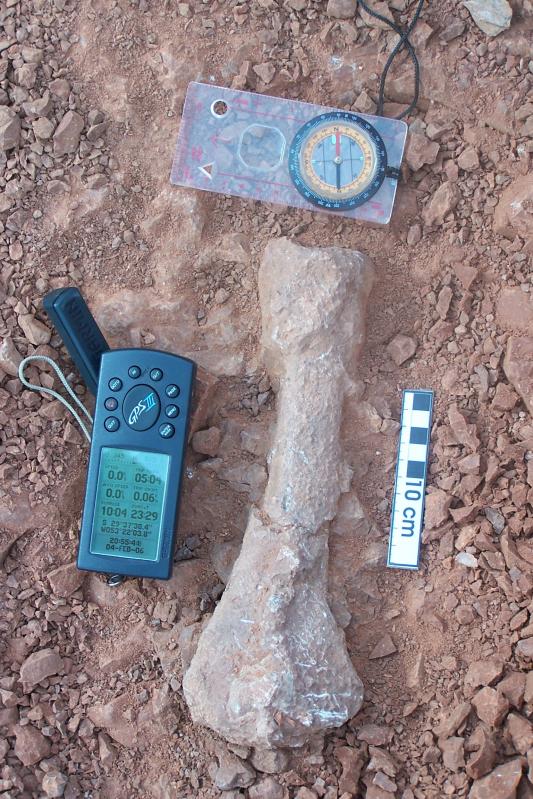 Fragmento de osso fóssil encontrado no afloramento.(Autor: Henrique Zerfass/2006)