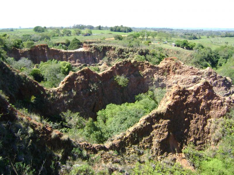 The site of geodiversity Buraco Fundo is an outcrop formed by large depressions that can reach up to 15 meters deep. These features were generated from a large erosive process that exposed large amounts of rock. Currently, actions have been provided to contain the erosive process of the land. Access for visitation is carried out through unpaved roads from the city of Restinga Seca towards the locality of Faxinal to the south of the same municipality. The site of geodiversity corresponds to the geological unit interspersed sandstone and conglomerates (Santa Maria Formation – Middle Triassic), and basically presents an association of sedimentary deposits related to river channels.