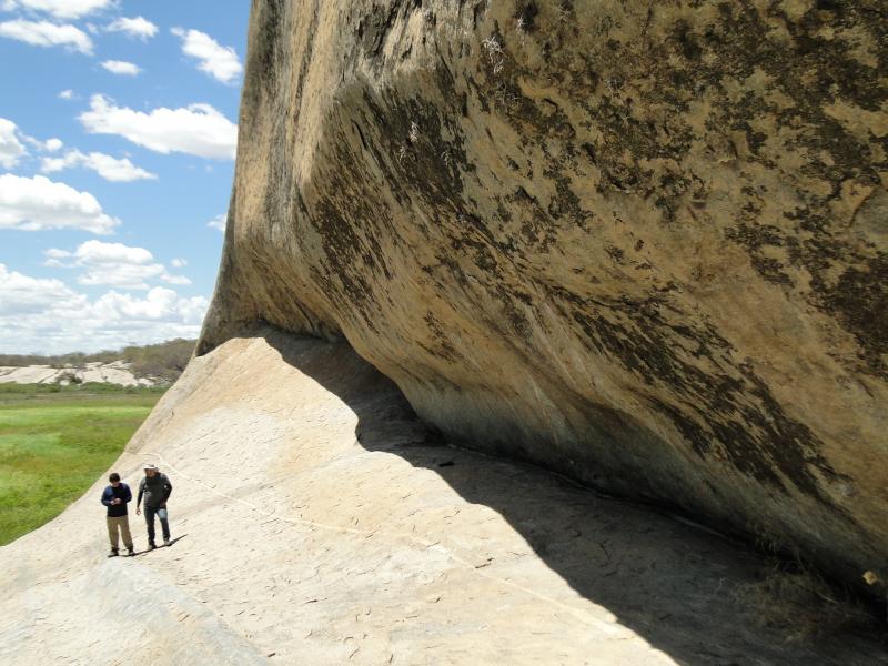 | The Lagoa do Fofô geosite is located 47 km south of Quixeramobim. The access, from Quixeramobim, is made by the state road CE-166, with a 42 km route on an asphalt road to the District of Encantado, from where a carriage road is accessed in the northwest direction, covering an additional 5 km to the locality of Lagoa do Fofô, which borders the geosite. This geosite is composed of two inselbergs (Bornhardts), with concave-convex slopes and a few structural discontinuities, where spheroidal exfoliation processes predominate. These inselbergues are supported by rocks from the Muxurê Novo Suite - Super Suite Quixeramobim, with porphyritic granite, locally foliated, containing mega crystals of Kfeldspar and plagioclase, surrounded by oriented Hornblende crystals. In these inselbergs, dikes, fractures, block dejections, structures in flame shadow and shear strips, syn-magmatic foliages and microcline xenocrystals can be observed. It therefore represents elements of fiery interest, cinematic indicators, magma rheology, structural and mineralogical. In a shelter at the base of the inselberg near the shore of the Fofô lagoon, which gives its name to the Geosite, a panel of rock art approximately 25 m long by 2 m high, mostly composed of pure graphics, made using the techniques of painting and engraving. The paintings were done with iron oxide and the variation of shades occurs in red to orange yellow. Weathering was found to be quite active, with paintings showing faded patches of old ones. Another relevant factor concerns the overlapping of paintings, which denotes that there was a second moment when the panel was painted. In the quantitative evaluation obtained using the Geossit application, it is found that the Lagoa do Fofô geosite has scientific value for national relevance. |