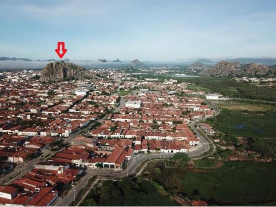 Vista aérea de parte da cidade de Quixada com destaque para o geossítio Pedra do Cruzeiro (Seta Vermelha). Foto:... |