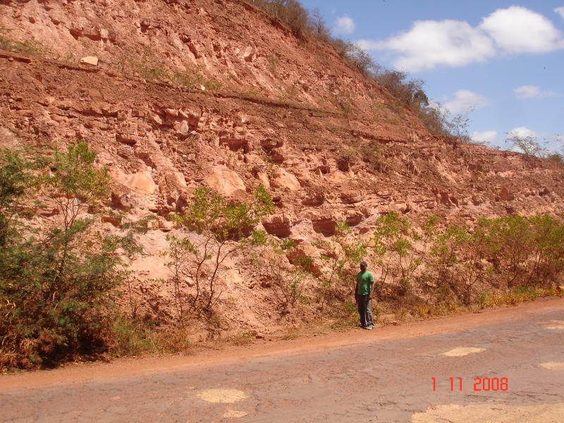 Detalhe da alternância das areias e argilas no afloramento, em questão, corte de estrada BA-052. Foto: Antônio José...