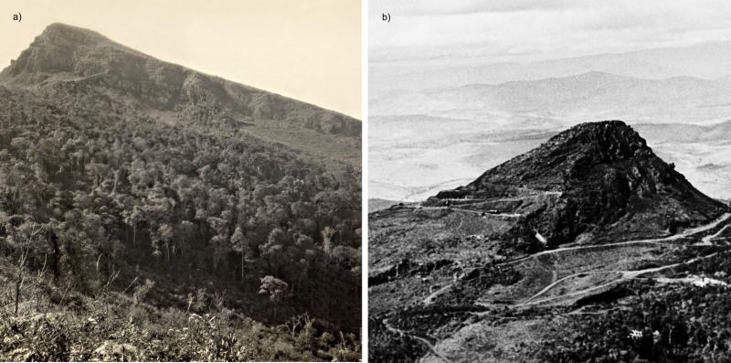 | Pico do Cauê, located in Itabira-MG, northeast of the Quadrilátero Ferrífero is the type locality of the Cauê Formation, a sequence rich in iron formations, responsible for all iron ore production in the Iron Quadrangle. It is the site where five new minerals associated with Au-Pd mineralization, known as "Jacutinga", were discovered. These minerals (arsenopaladinite, atheneite, isomertite, paladseite and jacutingaite) are listed by the IMA (International Mineralogical Association). It is the site where the first iron ore mining operation of the Iron Quadrangle was established, the Brazilian Hematite Syndicate, in 1909, and which later became the Companhia Vale do Rio Doce and currently VALE. |