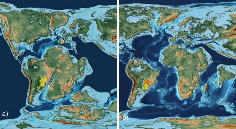 Fig. 6 - Reconstituição paleogeográfica de dois momentos da separação dos continentes (América do Sul e África) com... |