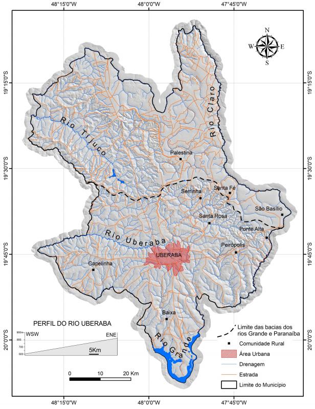 | O rio Uberaba nasce na região leste do município, próximo ao trevo que dá acesso a vila Ponte Alta, na rodovia BR-262, Km 756, na altitude de 1012 m, em um covoal que ocorre na chapada, percorre todo o município na direção E-W, ultrapassando seus limites até desaguar no Rio Grande. A nascente possui característica de campos hidromórficos que se caracterizam por apresentar lagoas temporárias, brejos e campos de murunduns, regionalmente conhecidos como “Covoais”, situados próximos as cabeceiras de drenagem, que são locais muito úmidos. |