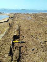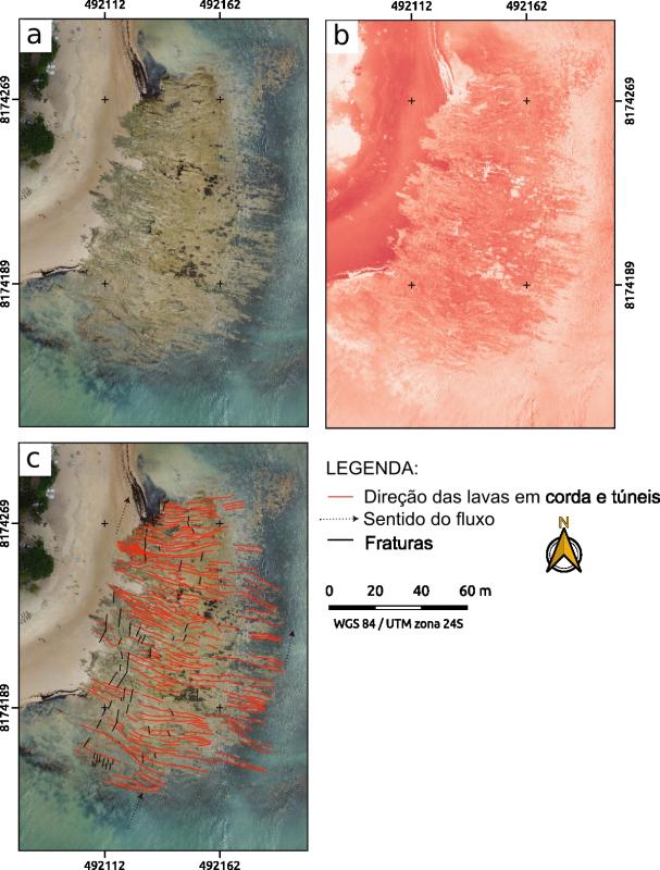 | On Pitinga Beach, in Arraial D'Ajuda, a district of Porto Seguro, Bahia, intriguing rocks emerge to the eyes of both geologists and laypeople. In this location, volcanic rocks with rope-like structures and tubes, akin to those seen in Hawaii, are found. Analogously, the volcanic rocks of Arraial D'Ajuda have their origin linked to intraplate volcanism associated with a hotspot. This volcanism is part of the Abrolhos Formation, occurring in the sedimentary basins of Espírito Santo, Mucuri, Cumuruxatiba, and Jequitinhonha. It constitutes a Cenozoic volcanic-sedimentary complex, with ages ranging from Paleocene to Eocene in the Abrolhos region (64 to 42 million years ago). In the Porto Seguro region, the Abrolhos Formation forms the rocky substrate of the Royal Charlotte Bank. A single Rb-Sr dating in a well in the region indicated an age of 28 million years (Eocene). Both in Abrolhos and Royal Charlotte, past volcanism played a crucial role in shaping the broad physiography of the continental shelf, enabling the establishment of corals and carbonate sedimentation in areas farther from the coast. The natural characteristics have led to the development of the highest known biodiversity in the South Atlantic. The latest pulses of volcanism in Royal Charlotte are observed in seismic profiles, reaching the upper part of the Miocene. The stratigraphic position of the outcrop at Pitinga Beach is close to the base of the Barreiras Group, which is exposed in nearby cliffs. It likely emerged through exhumation by waves that created a marine abrasion surface during the peak of the last Holocene transgression, approximately 5,700 years ago. The rocks emerge in an intertidal zone and are frequently impacted by waves during high tides. They are mafic rocks that exhibit significant weathering. The volcanic structures are represented by ropes and corrugations indicating a predominantly WNW-ESE direction and a sense towards NNW. Many of the rope-like structures developed tubes, suggesting the formation of surface crusts that kept the lava in a liquid state moving inside. The site holds significant scientific, cultural, and educational importance as one of the few, if not the only, outcrops displaying such structures in the Brazilian coastal region. Additionally, its features attract tourists in the area, presenting substantial potential as a geotouristic point of interest. Based on the gathered information and the fact that the site is in an area where mass tourism, real estate speculation, and extractivism occur, somewhat predatory in nature, protective measures are advised. This includes the creation of a restricted-use conservation unit. Despite being surrounded by numerous public and private conservation units, as well as indigenous lands, successive state and municipal administrations have done little to control and prevent the degradation of the natural heritage in this region. |