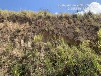 Afloramento de aproximadamente 700 m, contato discordante por erosão dos arenitos com lentes argilosas e microconglomerados e metarenitos da Membro Pedrão com o embasamento cristalino alterado.