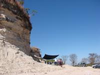 | Tipo e dimensões do afloramento, contato, espessura, outras informações descritivas do sítio. : | Afloramento em colina, exibe uma frente de escavação onde foram encontrados diversos fósseis de diferentes espécimes. Apresenta altura média de 15 metros, e extensão de aproximadamente 80 metros. |