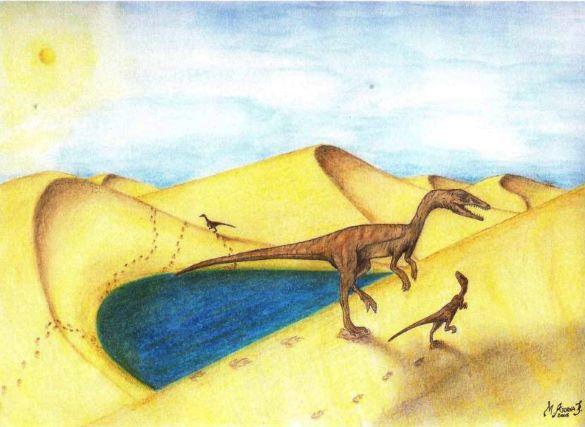 | O geossítio exibe registro de icnofósseis de tetrápodes em arenitos da Formação Rio Paraná (Grupo Caiuá) na região de Pontal do Paranapanema, extremo oeste do estado de São Paulo. Situa-se a jusante da estrutura de concreto da Usina Hidrelétrica de Porto Primavera. Ocorrem em depósitos de estratos frontais de dunas eólicas, em quartzo-arenitos de cor marrom-avermelhado a arroxeado com estratificação cruzada de médio a grande porte. Os icnofósseis encontram-se em intervalo de 6 a 8 metros acima do contato com basaltos, na base da seqüência neocretácea. Encontram-se preservados como epirrelevo côncavo em arenitos, exibindo a típica “meia lua“ de areia produzido pelo deslocamento do animal em substrato arenoso e inclinado. A associação faunística é composta por pegadas de dinossauros terópodes e pequenos mamíferos. As pistas dinossauróides são bípedes e apresentam ângulo do passo próximo de 180º, meio-passo com cerca de 13 cm; as pegadas são tridáctilas, mesaxônicas, com garras, e apresentam cerca de 9 cm de comprimento e divergência total de aproximadamente 80º. As pistas mamiferóides são possivelmente quadrúpedes com sobreposição primária total. Apresentam grande variação nas dimensões da passada. As pegadas são elípticas e apresentam cerca de 5 cm de comprimento. Este sítio constitui novo registro de pegadas de tetrápodes para os arenitos do Grupo Caiuá e amplia a área de ocorrência dessa fauna tão pouco conhecida dos ambientes desérticos do Cretáceo brasileiro, indicando que mesmo as regiões mais centrais do Deserto Caiuá eram ocasionalmente freqüentadas por predadores ou habitadas por animais adaptados à aridez. |