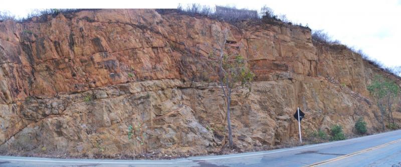 It represents a road cut from Estrada Parque, BA - 148, in silicified metaarenitic rock from the Serra da Gameleira Formation, quite fractured and/or tectonized with large to very large cross-channeled bedding, interspersed with mylonitic and ultramylonitic levels in agreement with the foliation. rock, metabreccias and subordinate pelitic levels. They configure metasedimentary rocks for presenting primary structures indicative of aeolic environment